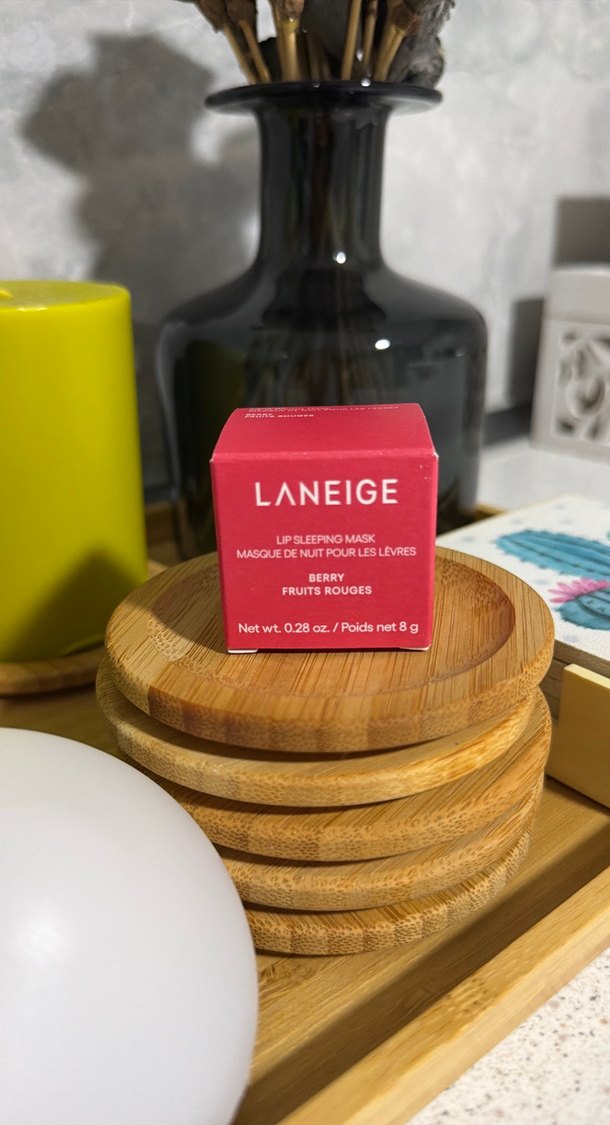 Laneige Berry dudak maskesi, canlı kırmızı renkte ve 8 gram ağırlığında. Gece boyunca dudakları besler.