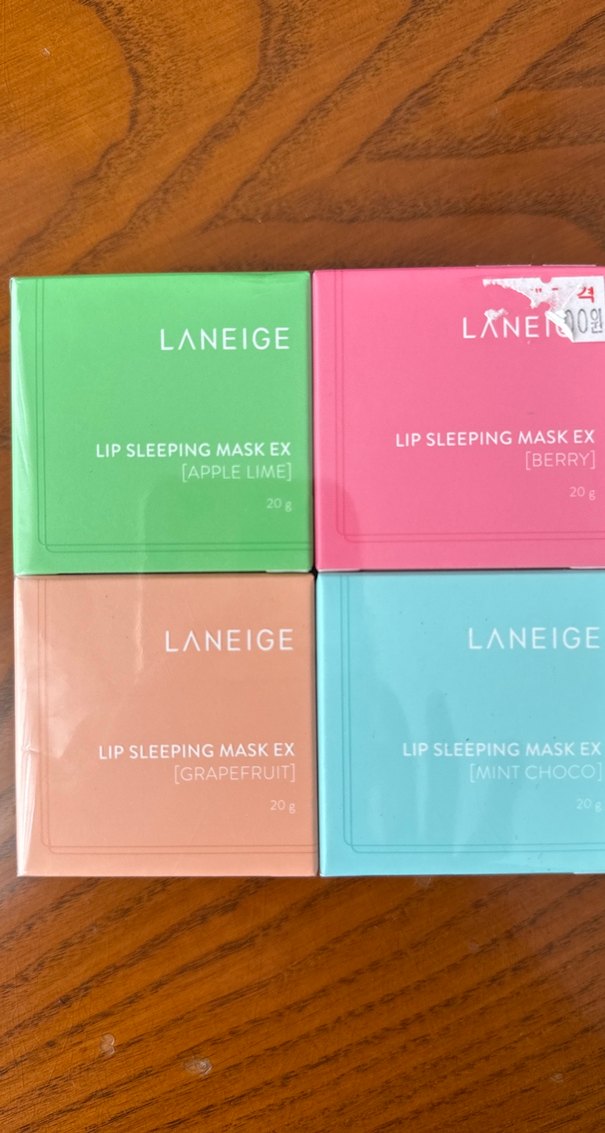 Laneige Lip Sleeping Mask EX, 20g, dört pastel renkte: Apple Lime, Berry, Grapefruit ve Mint Choco. Nemlendirici dudak bakımı sağlar.