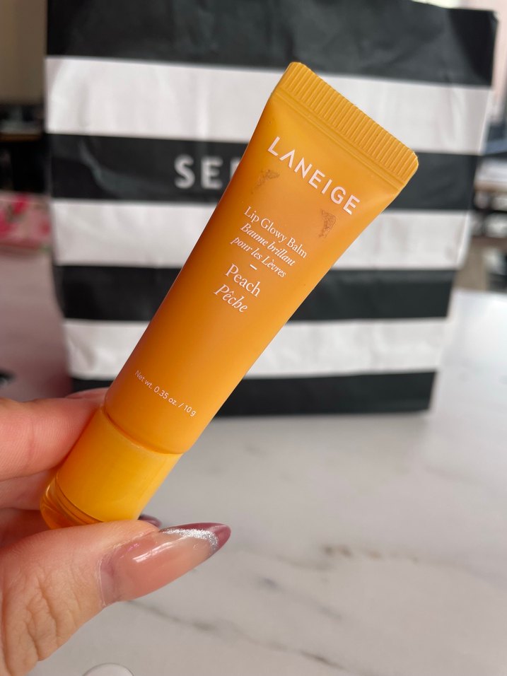 Laneige dudak parlatıcısı, şeftali tonlu açık bej renkte, dudaklara parlaklık ve nem sağlar.