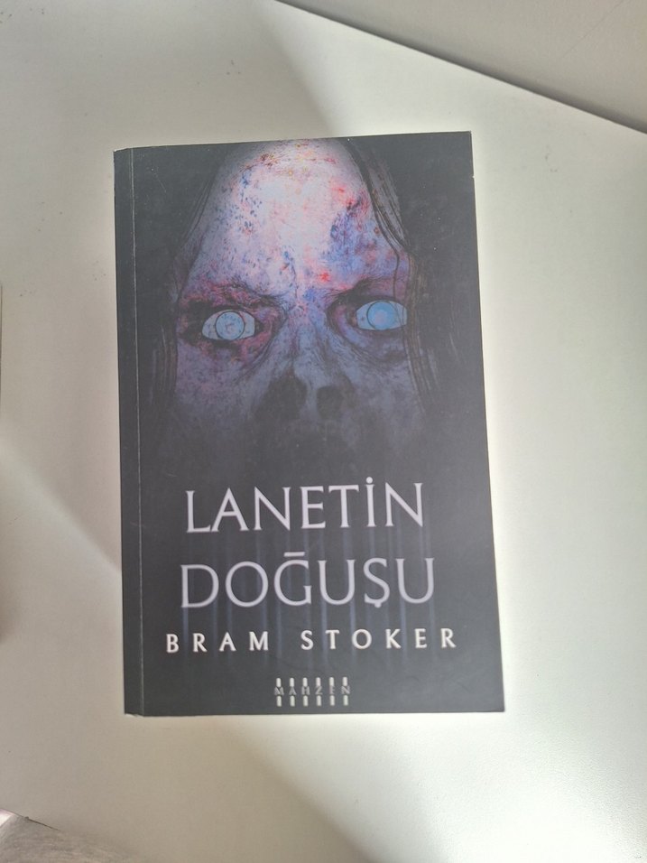 Bram Stoker'ın "Lanetin Doğuşu" adlı romanı, korku temasını yansıtan hayaletimsi yüzlü karanlık bir kapakla sunuluyor.
