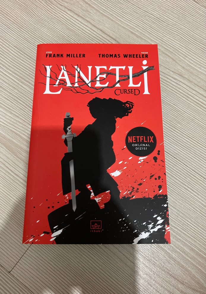 Frank Miller ve Thomas Wheeler'ın yazdığı, Netflix orijinal dizisi olan "Lanetli" romanı. Kapağında kılıç tutan gölgeli figür ve kırmızı zemin bulunuyor.