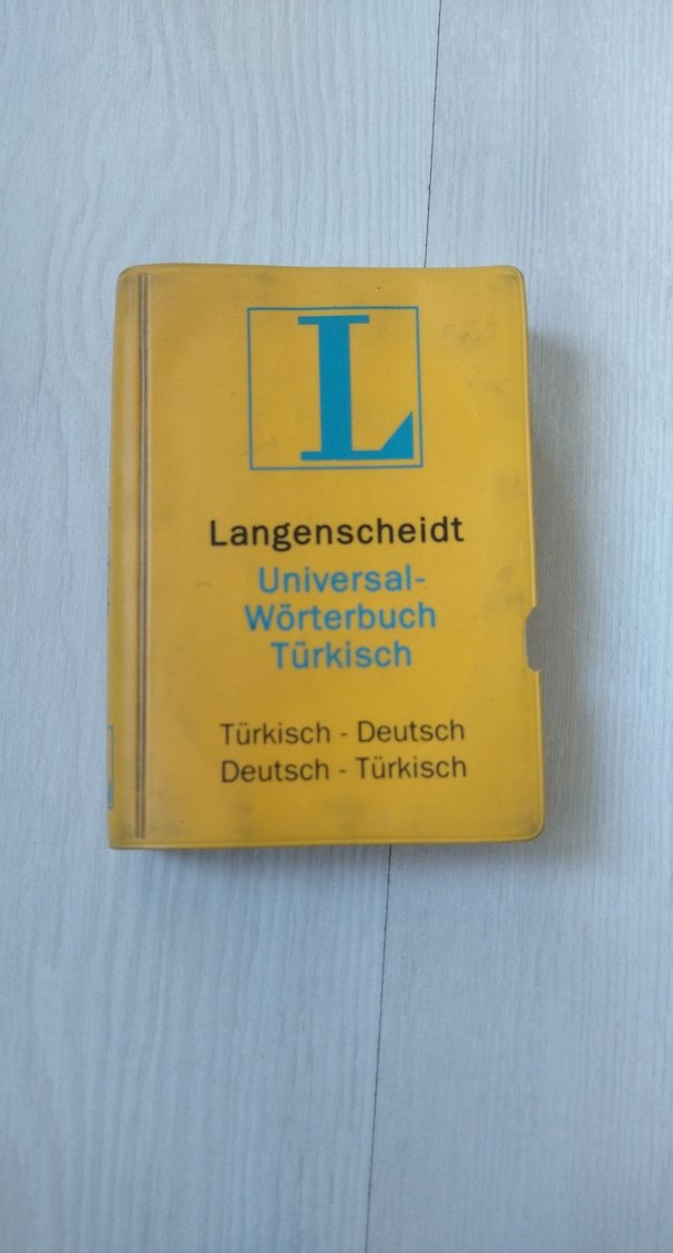 Langenscheidt evrensel sözlük, Türkçe-Almanca ve Almanca-Türkçe çeviriler içerir, kompakt sarı kapaklı.