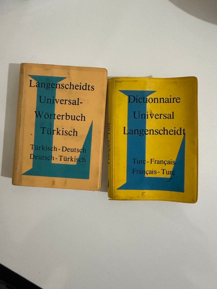 İki Langenscheidts evrensel sözlük seti: Türkçe-Almanca ve Türkçe-Fransızca, dayanıklı kapaklı. Küçük boy