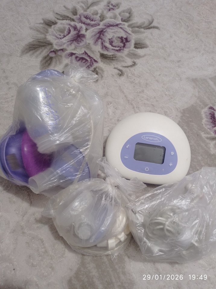 Pastel mor renkte, dijital ekranlı göğüs pompası ve çoklu aksesuarları şeffaf poşetlerde paketlenmiş olarak sunulur. hiç bir sorunu yoktur