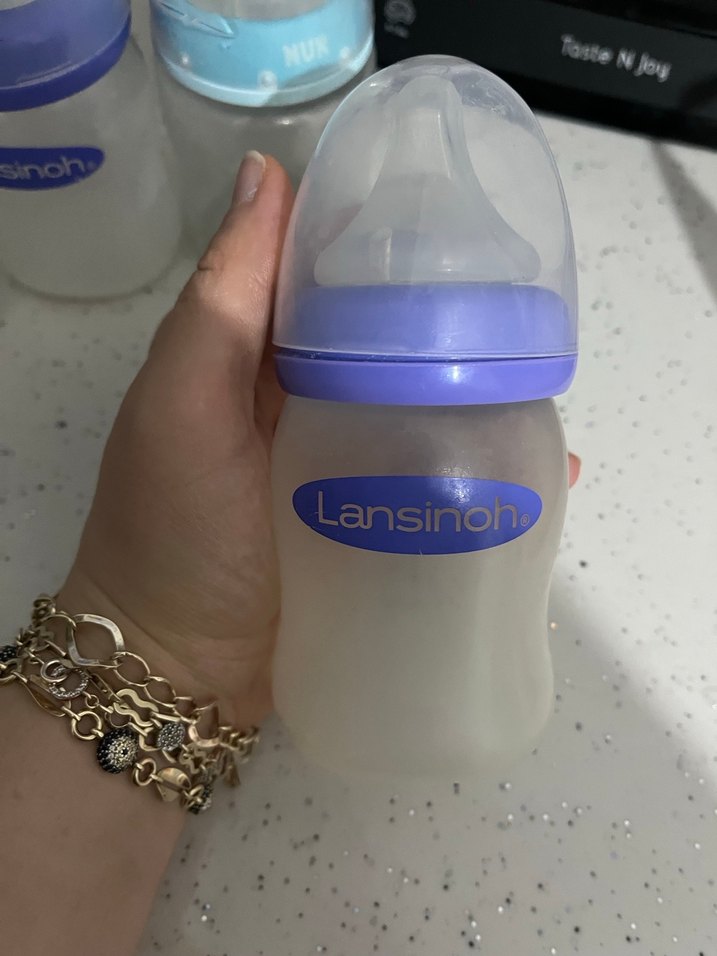 Lansinoh marka, pastel beyaz renkte, yumuşak emzikli ve koruyucu kapaklı bebek biberonu. Rahat besleme için uygun.