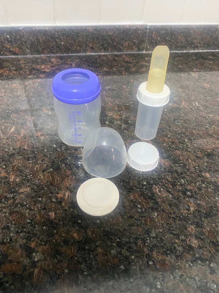 Ölçü işaretli, mavi renkli bebek biberonu ve birkaç çıkarılabilir parça, emzik ve kapaklar içerir. Lansinoh marka sadece süt saklamak için kullanıldı emzik ucu alınıp biberon olarak kullanılabilir, yanındaki anne sütünü kaşıkla vermek içindir