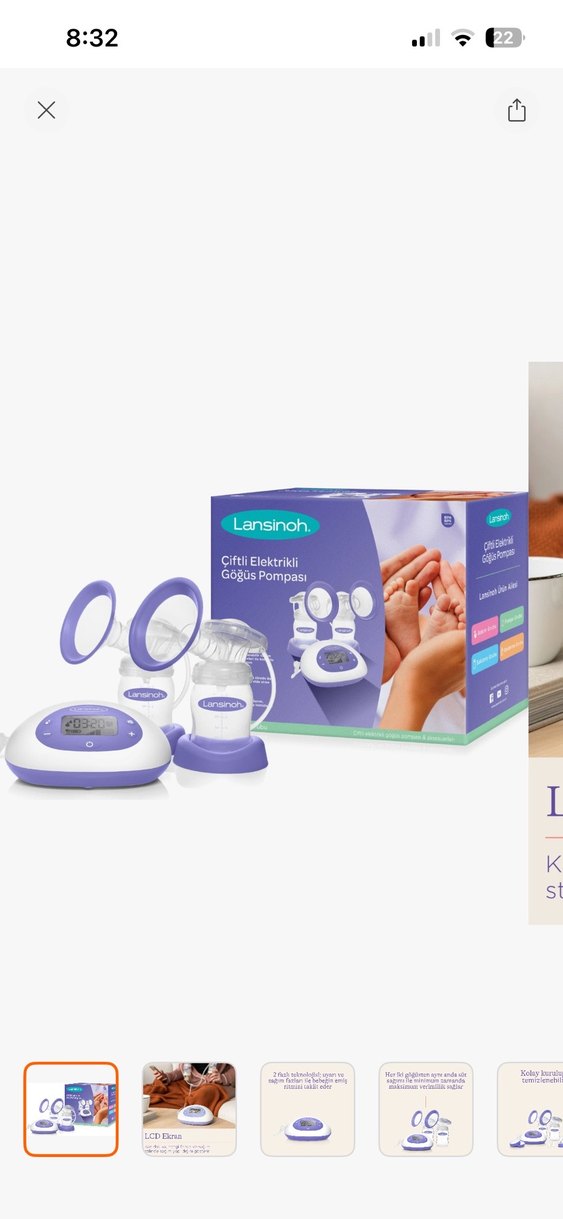 Lansinoh mor renkli çiftli elektrikli göğüs pompası, dijital ekran ve rahat tasarımıyla etkili süt sağımı sağlar.