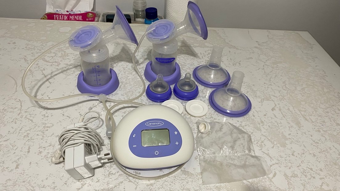 Lansinoh marka mor renkli elektrikli göğüs pompası, dijital ekran ve çeşitli aksesuarlar içerir. Çok az kullandım biberon uçları hiç kullanılmadı tertemiz sorunsuz
