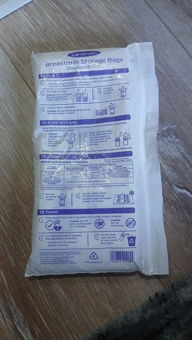 Lansinoh marka bej renk göğüs sütü saklama poşetleri, dolum ve pompalama talimatlarıyla birlikte, 46 adet poşet içerir.