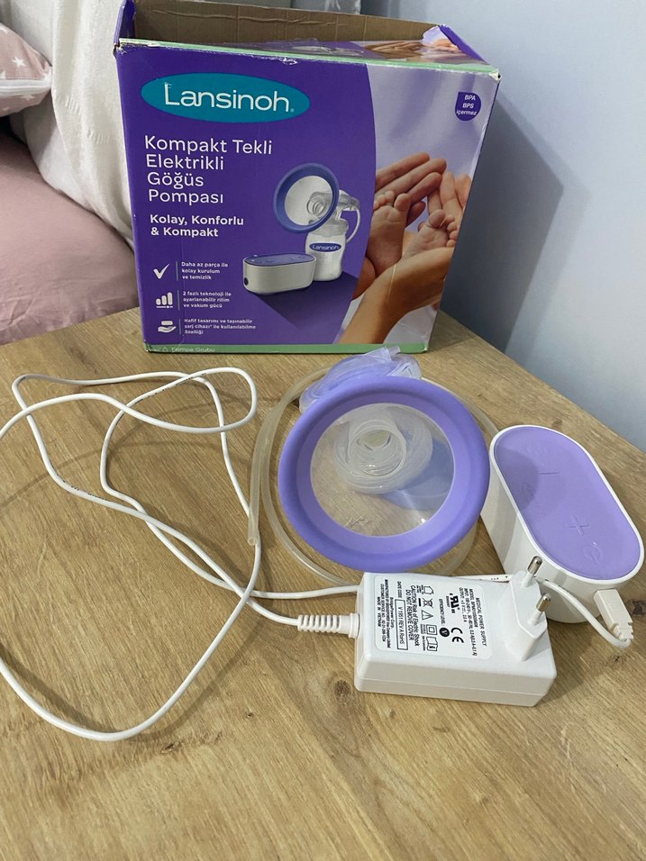 Lansinoh'un açık mor renkli kompakt tekli elektrikli göğüs pompası, kolay ve konforlu kullanım sağlar. Güç adaptörü ve yumuşak silikon parça içerir.