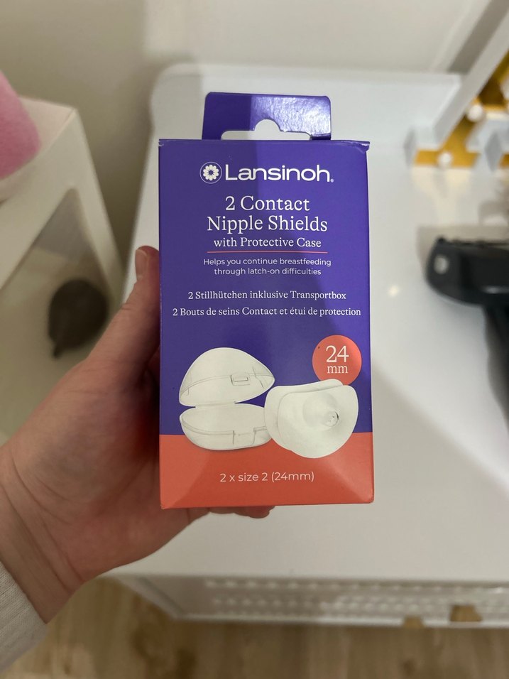 Lansinoh markasına ait, 24 mm boyutunda 2 adet göğüs ucu kalkanı ve koruyucu kutu içerir. Emzirme sırasında kolaylık sağlar. Hıc kullanılmadı sadece kaynar suda sterıl edildi kutusuyla beraber gonderılecek