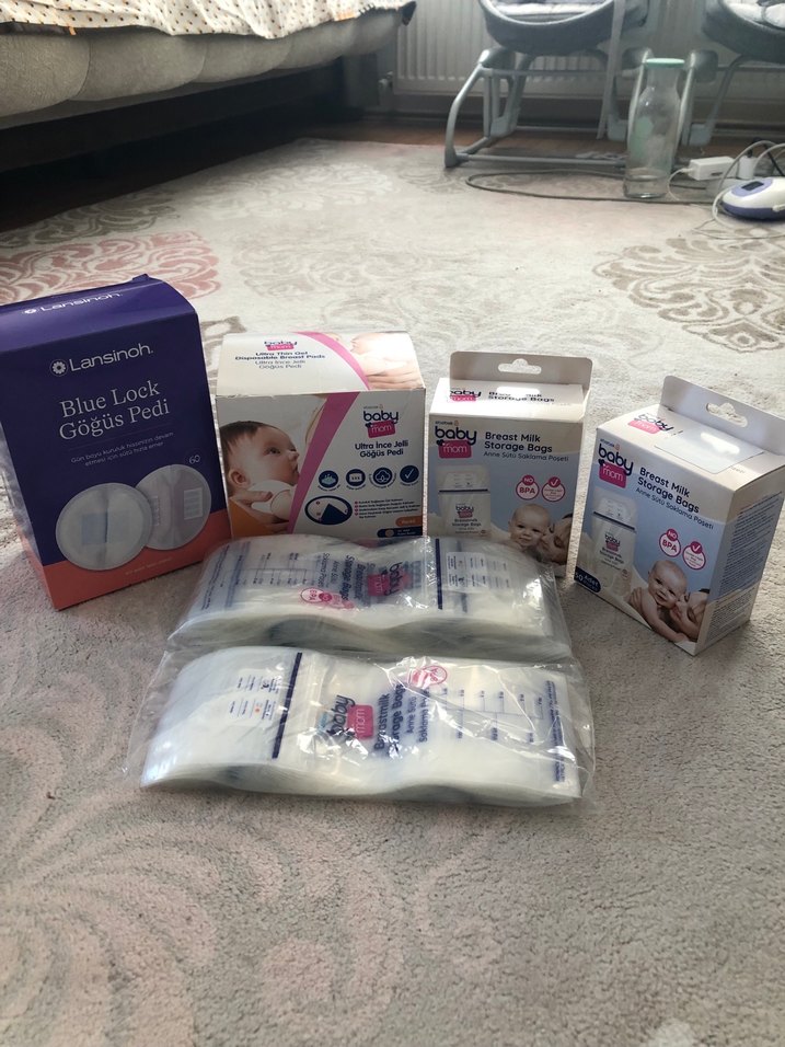 Lansinoh göğüs pedi içinde 45 adet Baby mon göğüs pedi sıfır kutu açılmamış Baby mom süt saklama poşeti 2 adet sıfır kutulu Baby mon 50+25 süt saklama poşeti kutusuz Hepsi mayıs ayında alındı.