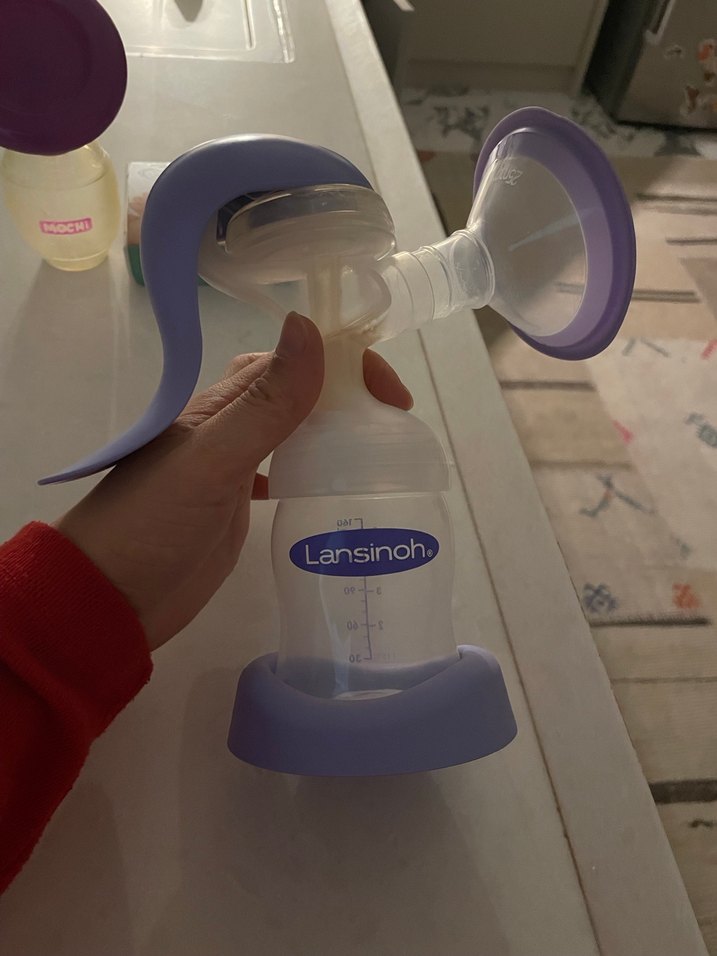 Lansinoh marka mor renkli manuel göğüs pompası, rahat kullanım ve ölçü işaretli şişe ile tasarlanmıştır.