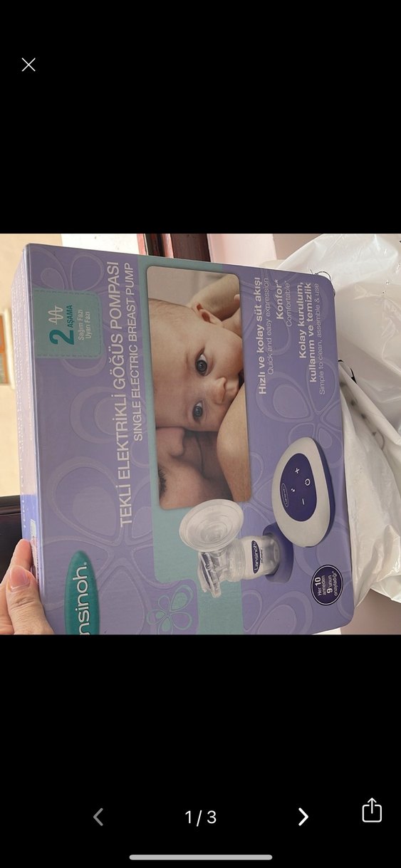 Hafif mor renkte tekli elektrikli göğüs pompası, hızlı ve nazik süt sağımı sağlar. İki aşamalı teknoloji ile kolay kullanılır ve temizlenir.