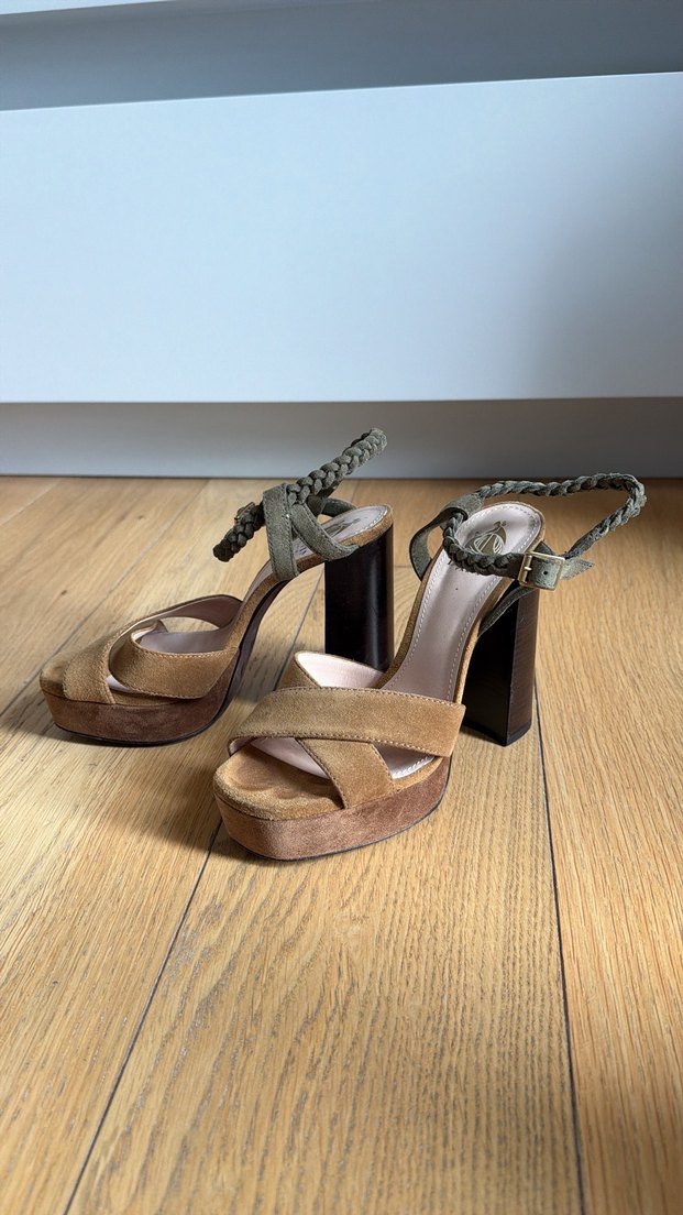 Bej süet platform topuklu, tokalı ve örgülü kayış detaylı, bohem tarzda romantik akşamlar için uygun ayakkabı.