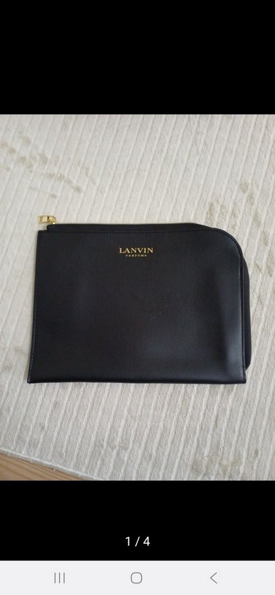 Lanvin marka siyah deri makyaj çantası, fermuarlı kapama ve baskılı logo detaylarıyla modern klasik tarzı ve klasik zarafeti bir araya getiriyor. sıfır kullanılmadı