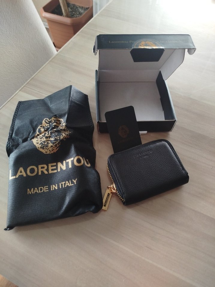 LAORENTOU erkek cüzdanı, koyu renk deri ve altın baskı detaylara sahip. Fermuarlı kapama ve orijinal kutu ile bez çanta dahil. İtalya yapımı.