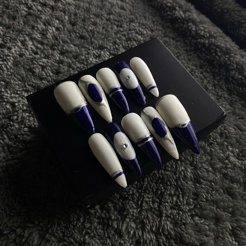 Lacivert ve beyaz renkli, parlak yüzeyli ve küçük taş detaylı tırnak süslemeleri. 10’lu el yapimi takma tirnak seti