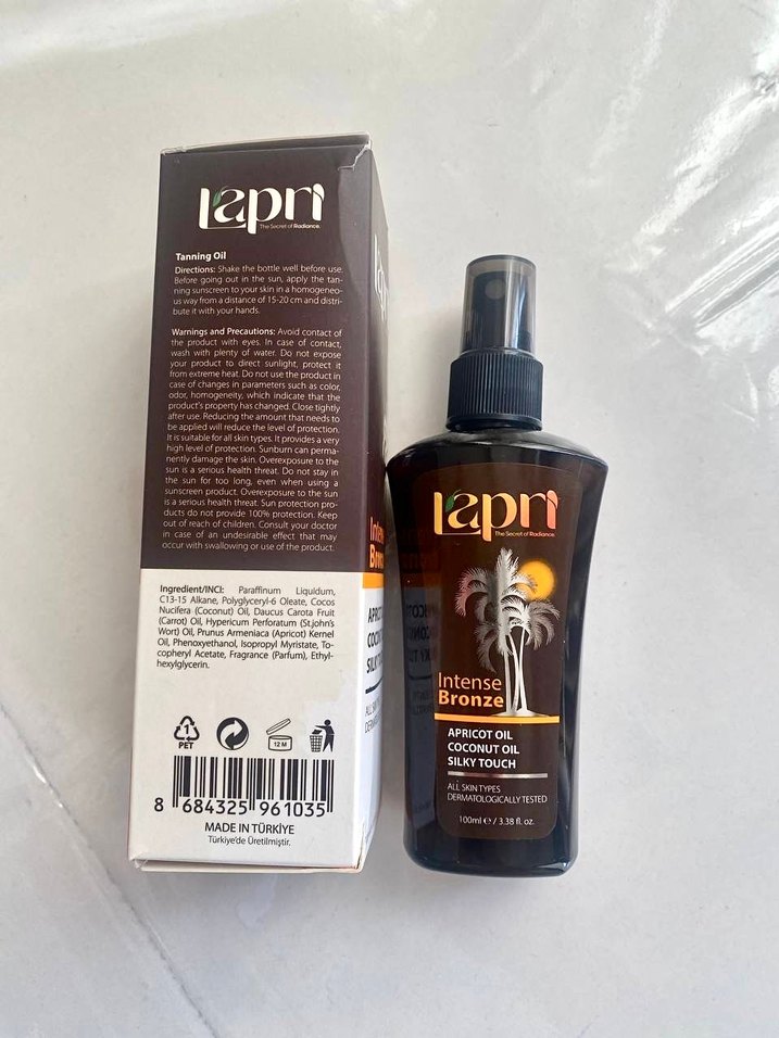 LAPN Intense Bronze kayısı yağı içeren bronzlaştırıcı yağ, ipeksi dokunuşla güneş altında bronzlaşmayı destekler. Tüm cilt tiplerine uygun ve dermatolojik olarak test edilmiştir.