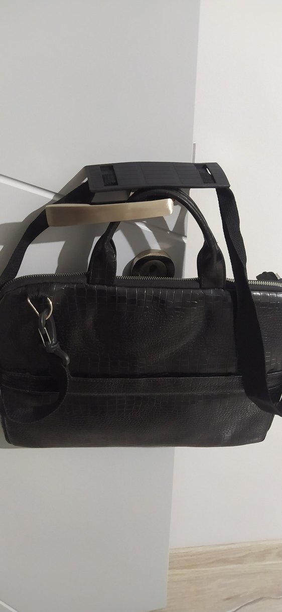 Tokalı ve ayarlanabilir askılı siyah deri kadın el çantası, iş ve günlük kullanım için şık, desensiz biker tarzında.