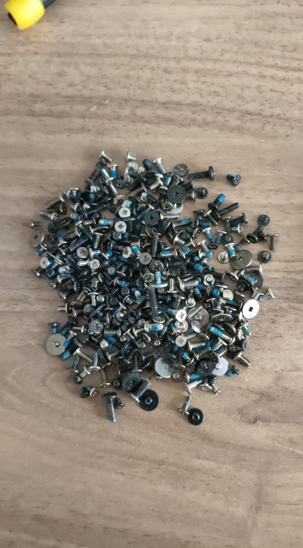 Laptop montajı için çeşitli boyutlarda metal gri vidalar seti.