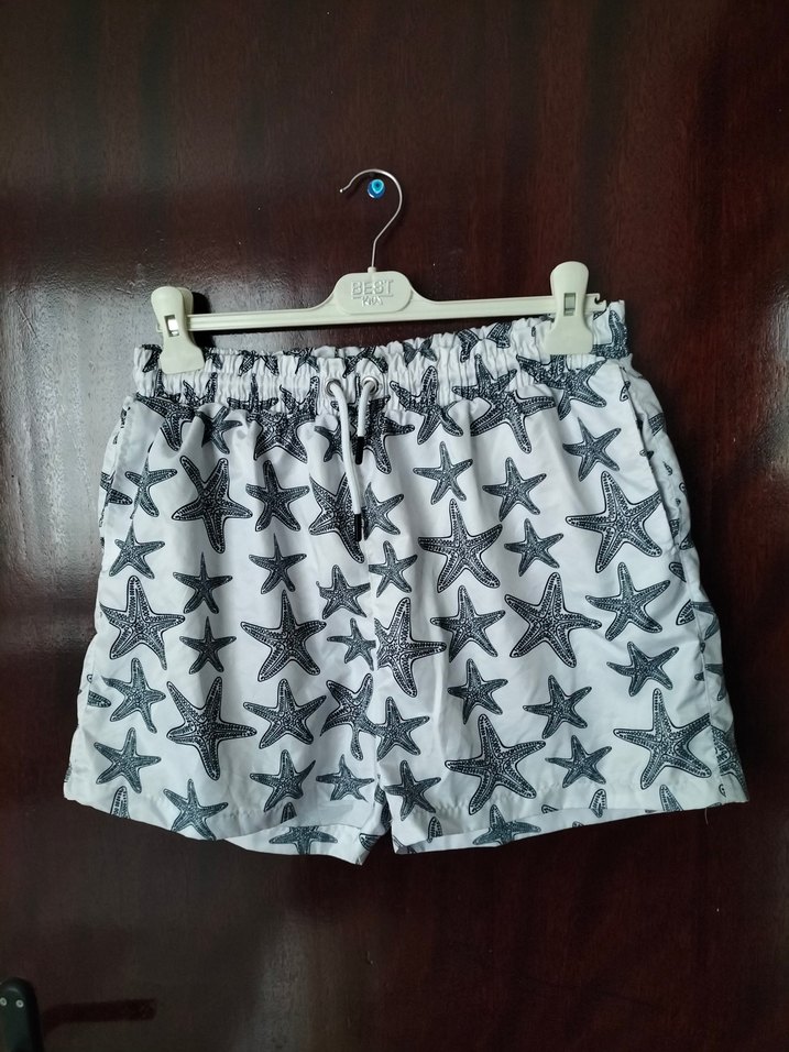 la boum marka large beden kısa cepli astarlı beyaz üzerine lacivert deniz yıldızı desenli deniz şortu arkasindaki metal nedeniyle ufak bir alanda renk değişimi mevcut onun dışında yeni gibidir #denizşortu #erkekmayo #erkekşort #beyazşort #laboum Beyaz kumaş üzerinde gri denizyıldızı desenli, bel bağcıklı ve bol kesim erkek şortu. Plajda rahat kullanım için uygundur.