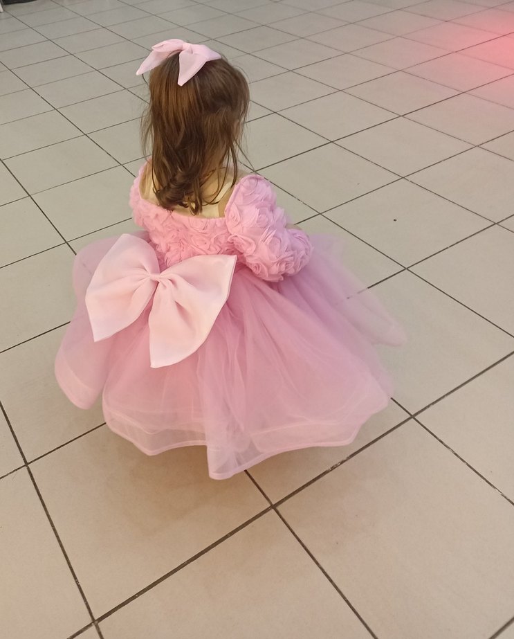 Pembe, büzgülü kolları ve kayık yaka detaylı klasik kesim kız çocuk abiye elbise. Arkada büyük fiyonk bulunur, yumuşak sentetik kumaştan yapılmıştır.(bir defa giyildi yeniden hiç bir farkı yok)bir saat anca durmustur üzerinde