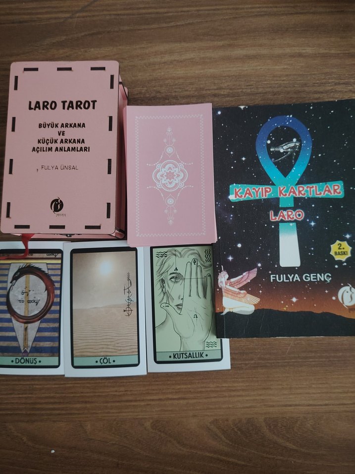 Laro Tarot kartları, büyük ve küçük arkana anlamlarıyla birlikte Fulya Genç'in Kayıp Kartlar kitabı ve sembolik çizimlerden oluşur. Pembe olanı Nadir ve zor bulunur.