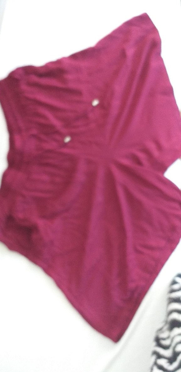 Düğmeli detaylara sahip, parlak bordo renkte, ipeksi kumaştan bol kesim hamile midi şortu. Minimalist sokak tarzı için deseniz sade tasarım.