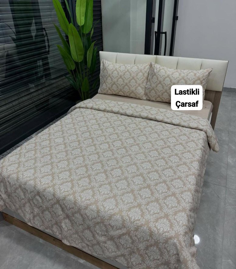 Lastikli kenarları ve açık beyaz tonlarda desenleri olan çarşaf ve yorgan kılıfı takımıdır.