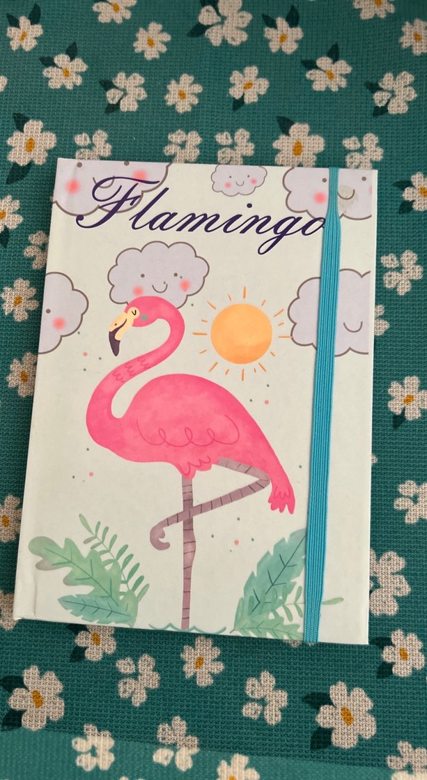 Pastel pembe flamingo desenli kalın kapaklı ve mavi lastik bantlı defter, neşeli bir görünüme sahip. Noktalı sayfalı, yaklaşık 50 sayfadır.