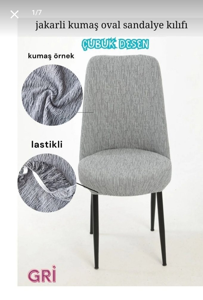 Lastikli, jakarlı kumaştan yapılmış gri oval sandalye kılıfı. Çubuk desenli baskıya sahip olup, sıkı oturması için elastik kenarları vardır. 4 adet kullanılmamış var elimde gri renk