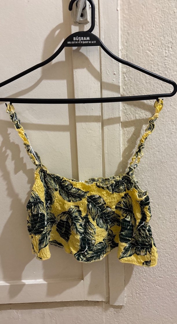 Koyu sarı batik desenli, siyah yaprak baskılı, ince askılı mini büstiyer, bohem sokak tarzı yansıtır.