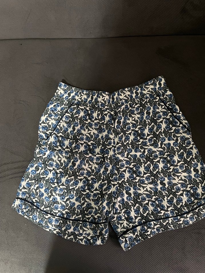 Yumuşak kumaştan yapılmış, mavi desenli bol kesim mini şort, günlük kullanım için uygundur.