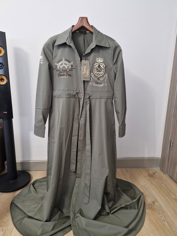 Latifa marka, düğmeli, yakalı uzun yeşil elbise. Bol kesim, uzun kollu ve cep detaylı, günlük kullanıma uygun casual tarzda. Likralı kumaş.
