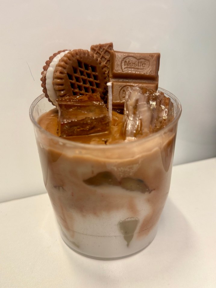 Üstünde detaylı çikolata ve bisküvi süslemeleri bulunan kahverengi latte mum.