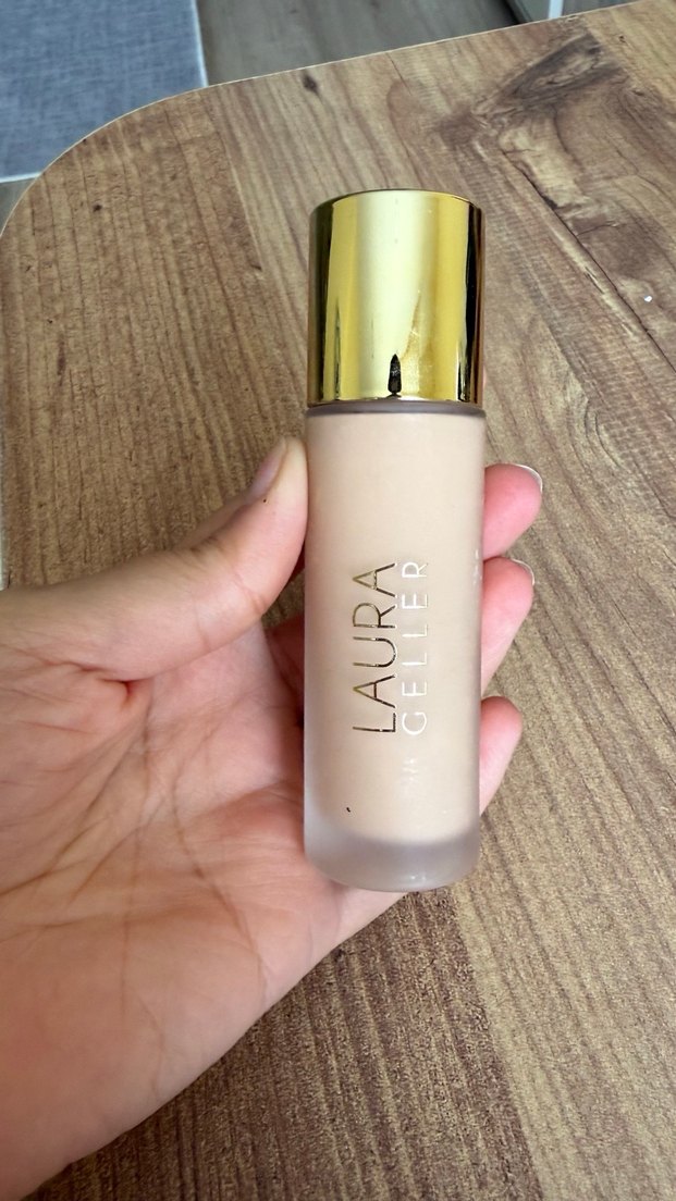 Laura Geller markasına ait açık bej tonunda, pürüzsüz bitişli fondöten. Altın kapaklı şişe ile. Birkaç defa kullanıldı tonu uymadığı için satıştadır Amerika’dan alındı