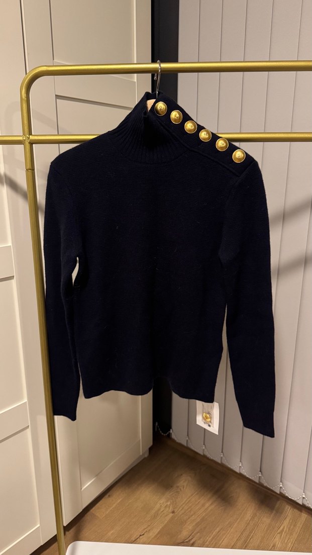 Düğmeli, yüksek yakalı, fitted kesim koyu renk yün kadın kazak. Uzun kollu ve günlük sokak stili için uygun.