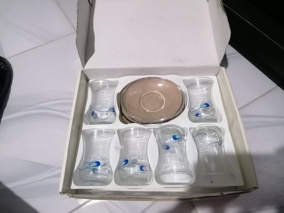 6 adet tavus kuşu desenli ince belli çay bardağı ve 6 adet tabaktan oluşan set. Sıfır ürün paketli