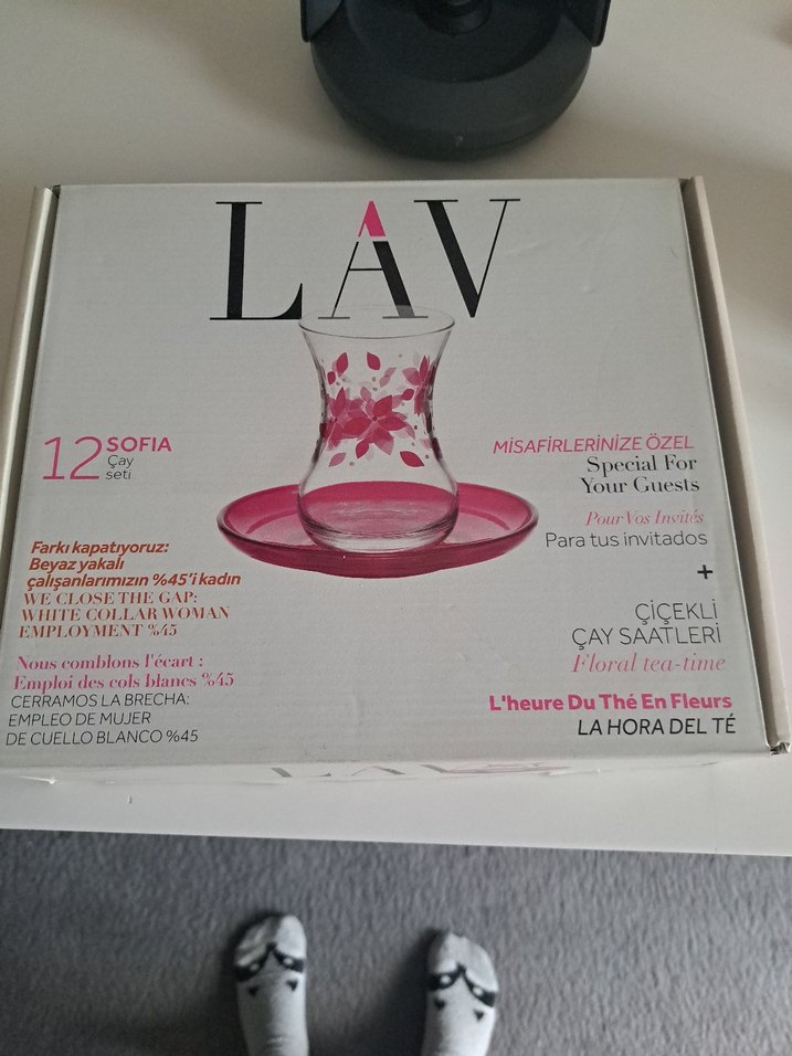LAV markalı, çiçek desenli, cam bardaklar ve pembe tabaklardan oluşan 12 parçalık çay seti. Misafirlerinize sunum için uygundur.