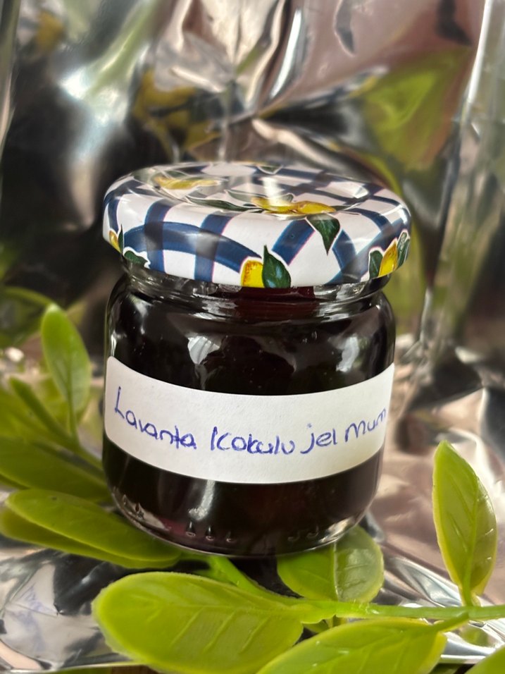 Desenli kapaklı kavanozda lavanta kokulu jel mum. Rahatlatıcı aroma ve jel kıvamı sunar. ️