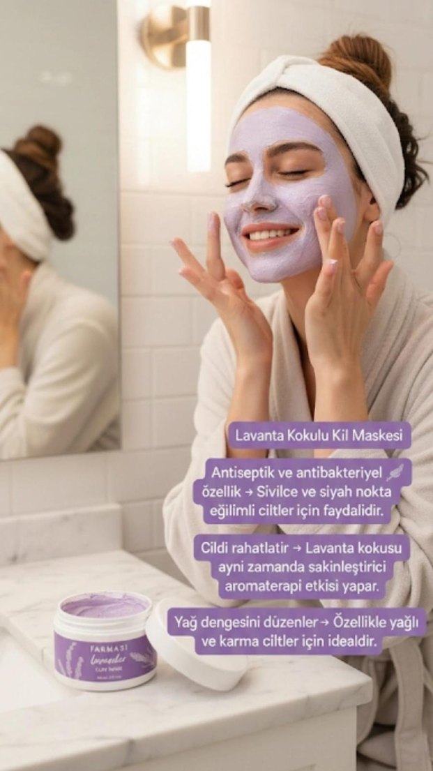 Lavanta kokulu kil maskesi, antiseptik ve antibakteriyel özelliklere sahiptir. Cildi rahatlatır, yağ dengesini düzenler ve yağlı ile karma ciltler için uygundur.