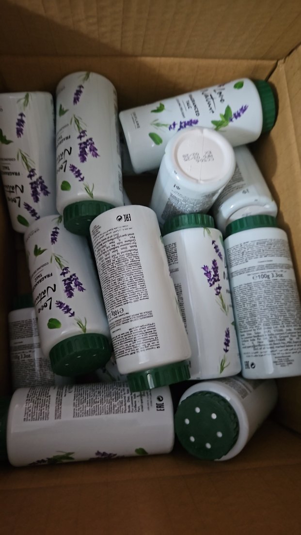 Yeşil kapaklı küçük şişelerde lavanta kokulu açık mor pudra. Cildi ferahlatmak ve yatıştırmak için uygundur.