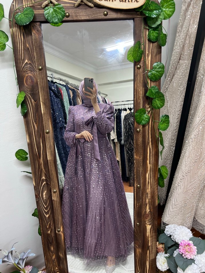 Lavanta lale desen , kolu fiyonklu Abiye Elbise. Ürün arkası iplidir. Birkaç beden aralığına uygundur.