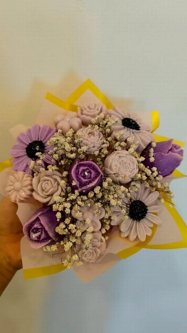 Lavanta renkli mumdan çiçeklerin beyaz detaylarla süslendiği, sarı ve pembe kağıda sarılı buket.