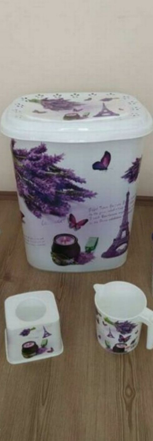 Lavanta ve kelebek desenleriyle süslenmiş, üzerinde Eyfel Kulesi resmi bulunan ev seti. İçinde maşrapa ve tuvalet fırçası bulunur sorunsuz