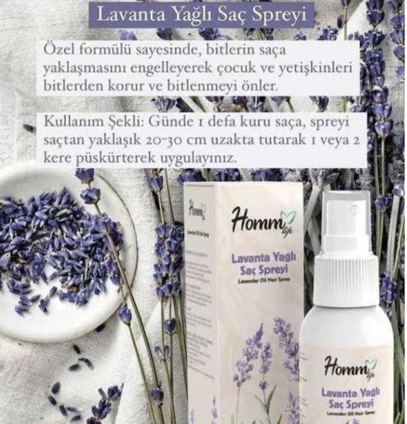 Lavanta yağlı saç spreyi, özel formülüyle bitlerin saça tutunmasını engeller, çocuk ve yetişkinleri korur. Kuru saça 20-30 cm uzaktan günde 1 defa püskürtülür.