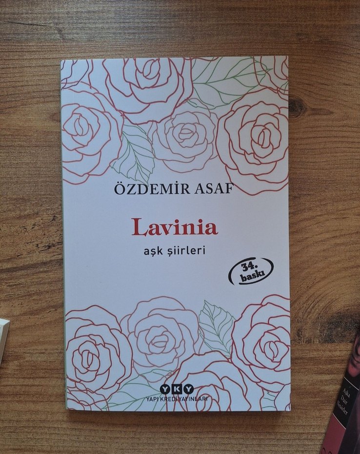 Özdemir Asaf'ın Lavinia adlı aşk şiirleri kitabı, kapakta zarif gül çizimleriyle romantik bir tema sunuyor.