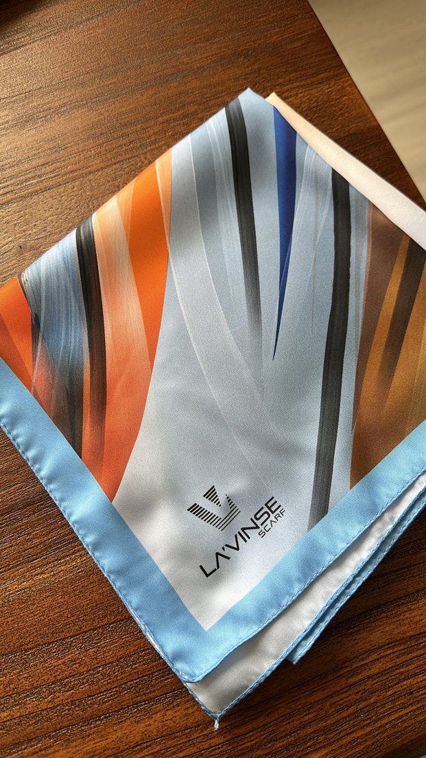 Kadınlar için çok renkli çizgili, ipeksi dokulu ve açık mavi kenarlı Lavınse fular. Drapeli ve çağdaş tasarıma sahip, iş ortamına uygun şık bir eşarp