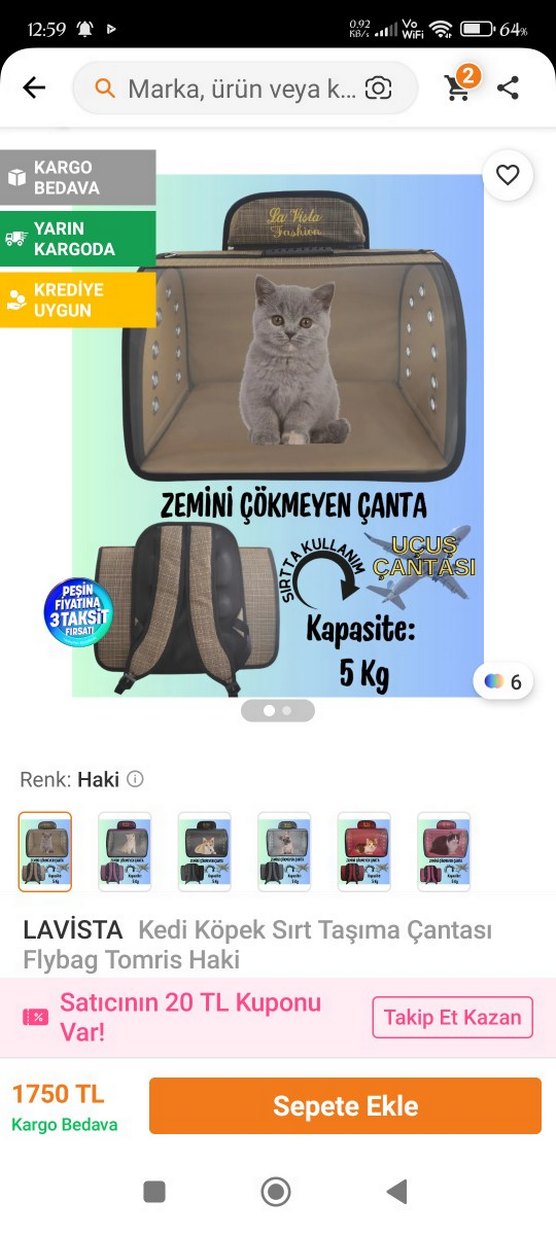 Lavista Flybag Tomris haki renkli kedi ve köpekler için sırt taşıma çantasıdır. Zemini çökmez, 5 kg kapasitelidir.pazarlık payı vardır